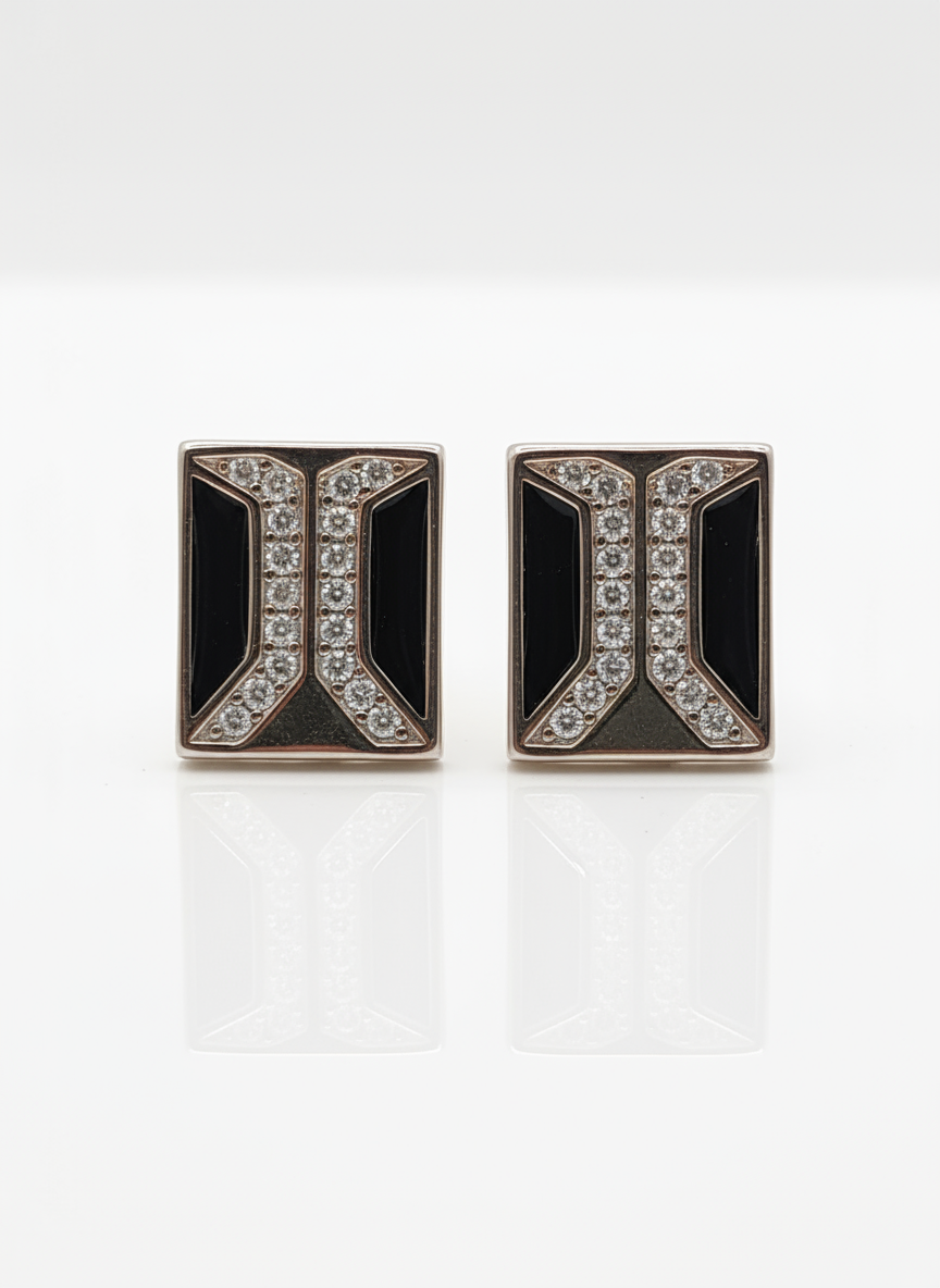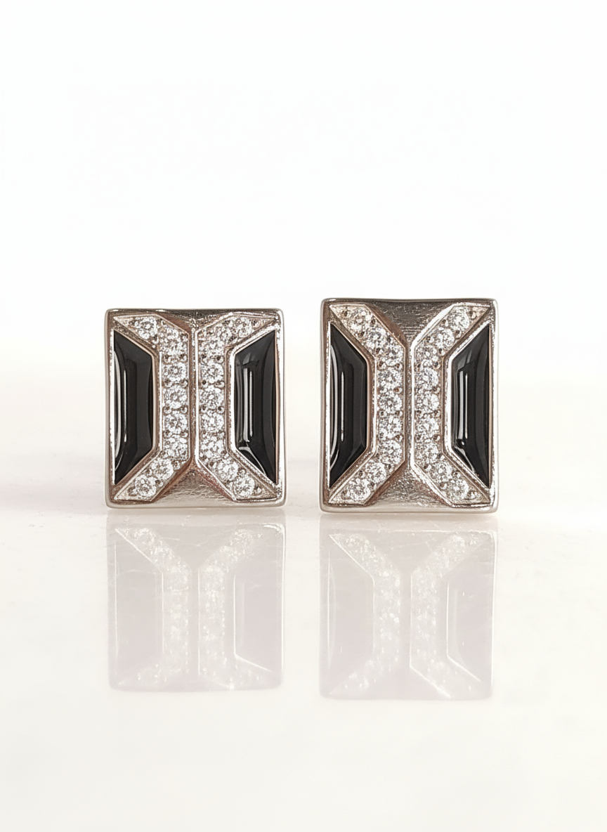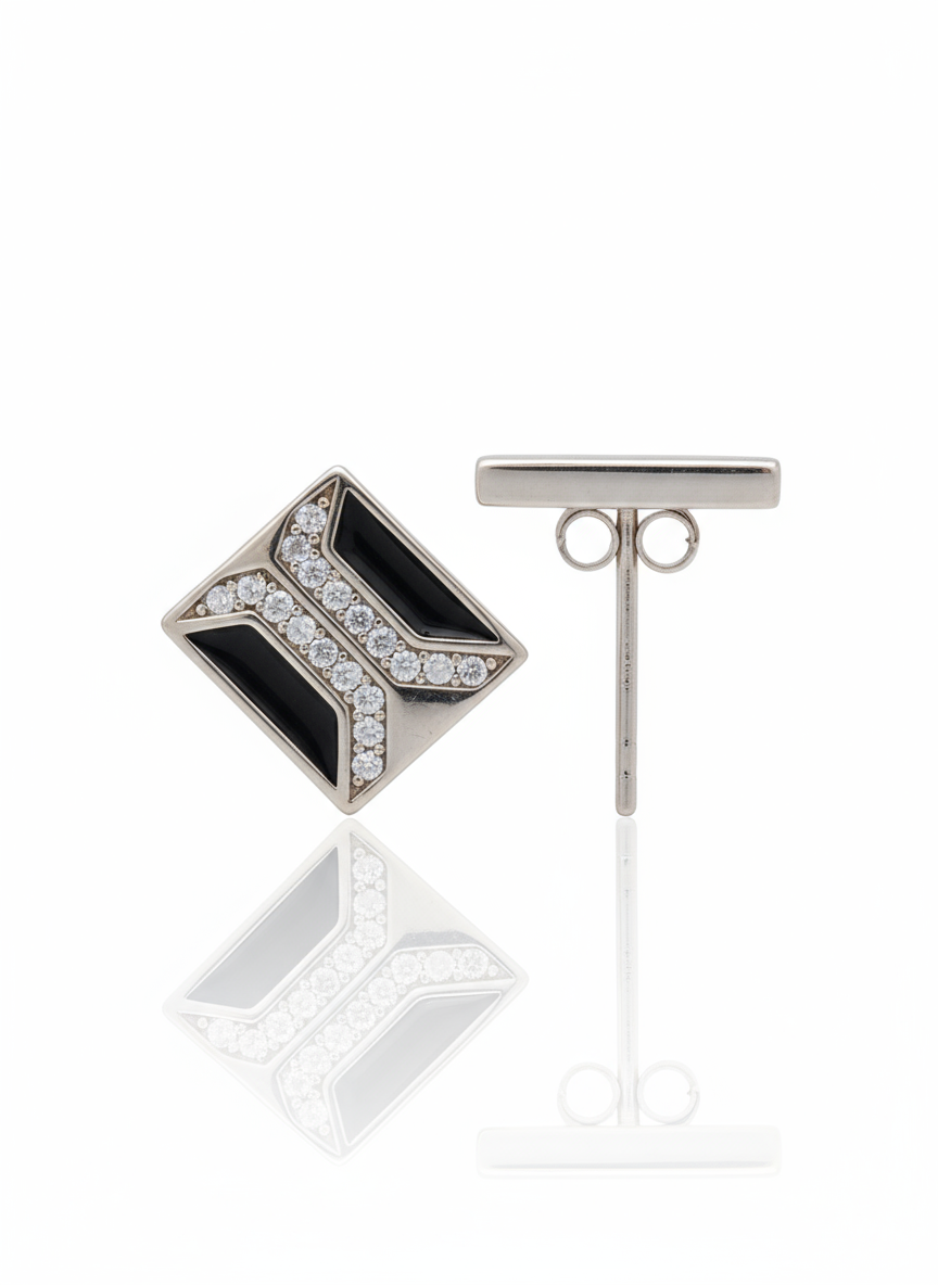 - Design: Geometric Square Stud with Black Enamel and Clear Stones