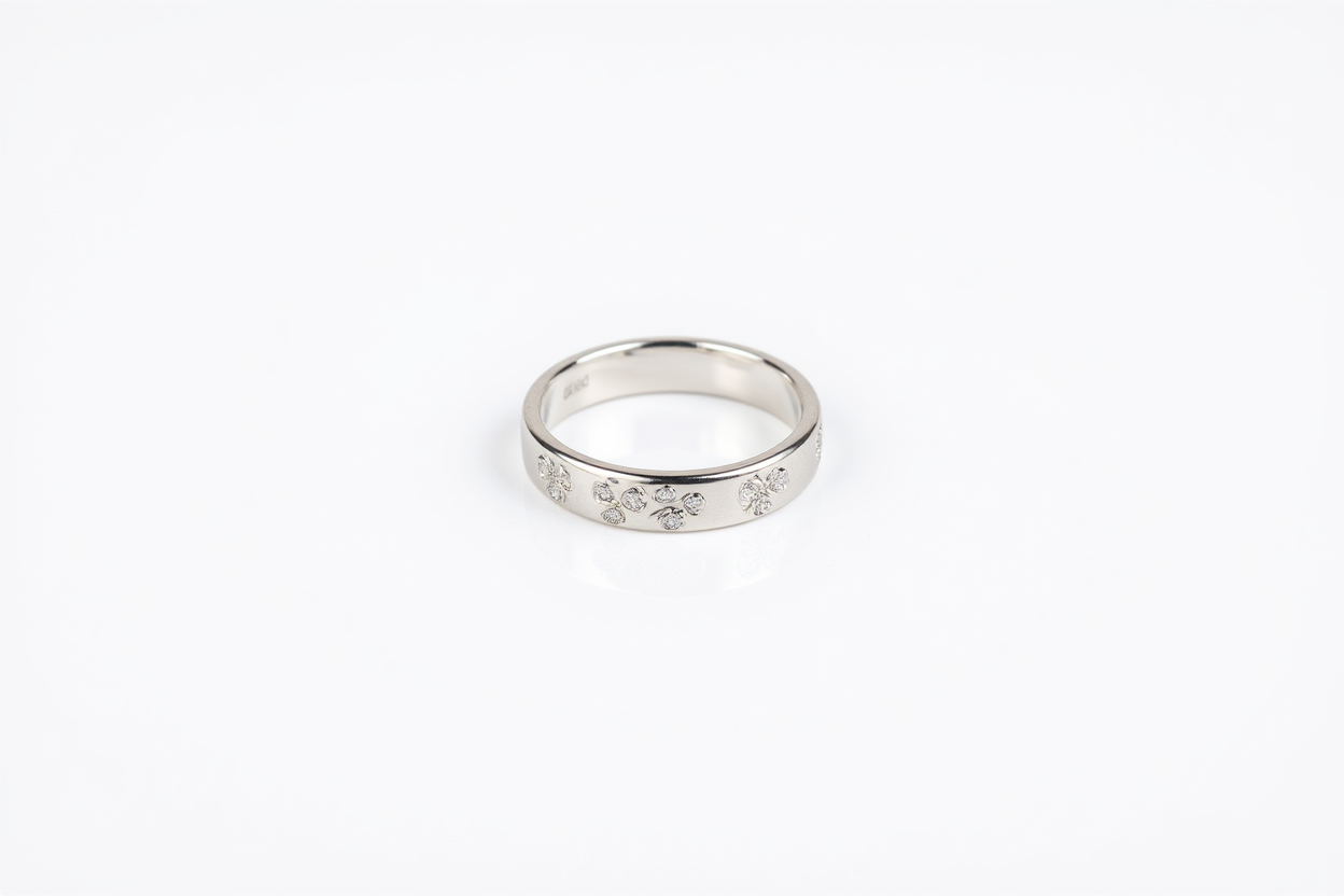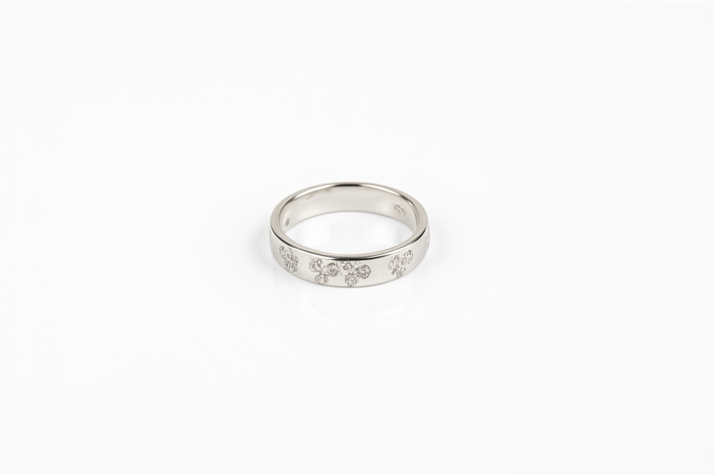 The Blossom Bond features a slender, polished sterling silver band adorned with intricately arranged sparkling accents that form a continuous pattern of delicate “blossoms” or floral motifs around the ring. The subtle shimmer adds a touch of glamour without overpowering, making it perfect for everyday wear or as an elegant accent for any occasion.