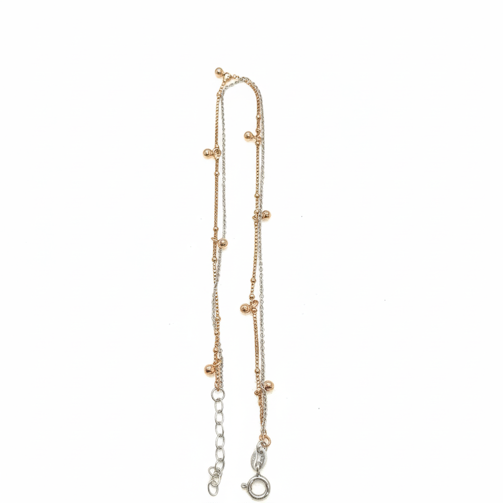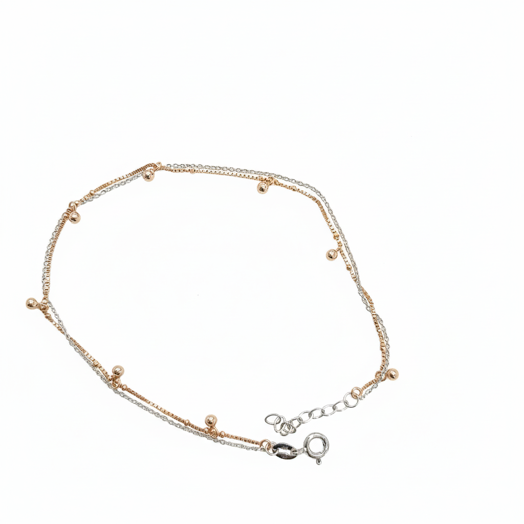Step into effortless elegance with this 925 Sterling Silver Double Layer Anklet, designed with delicate dual-tone silver and rose gold beads. The layered chains create a graceful shimmer, adding a hint of luxury to your every step.