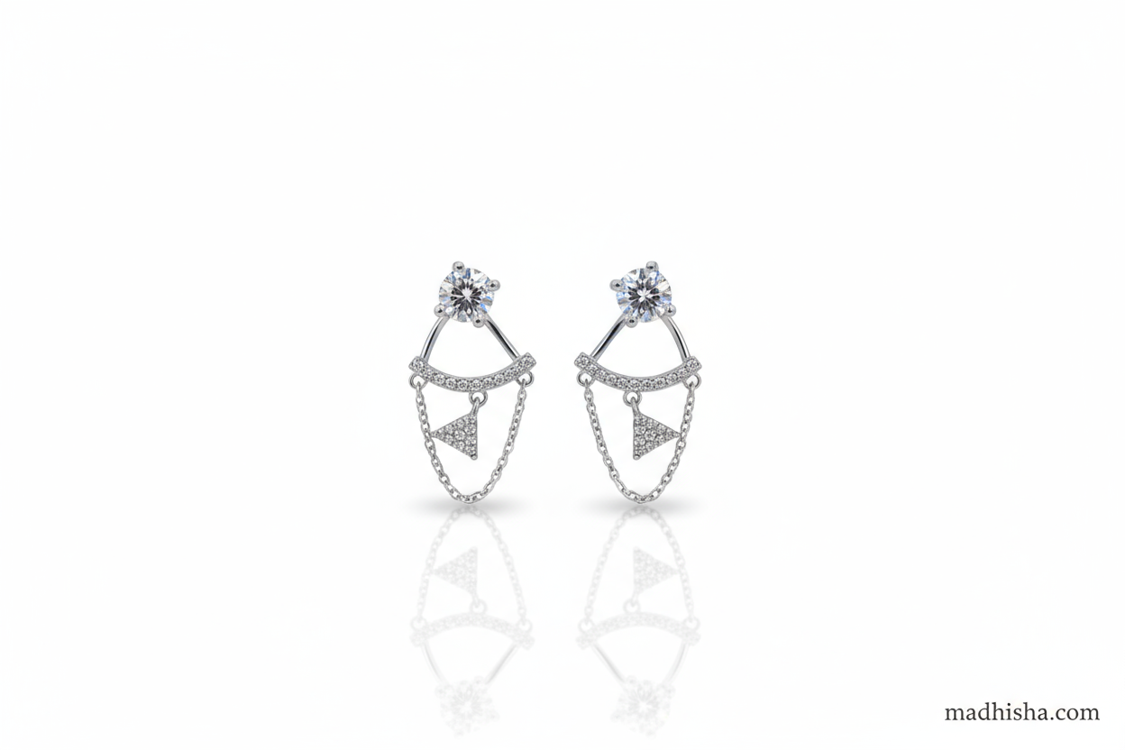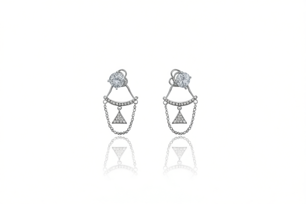 Make a statement with these captivating sterling silver earrings, designed for the modern trendsetter. These aren’t your average studs—they’re a bold blend of classic sparkle and contemporary flair. A brilliant cubic zirconia stone rests on your earlobe, anchoring a fine, shimmering chain that gracefully drapes down. The chain connects to a striking pavé-encrusted triangle, creating an edgy yet elegant silhouette.