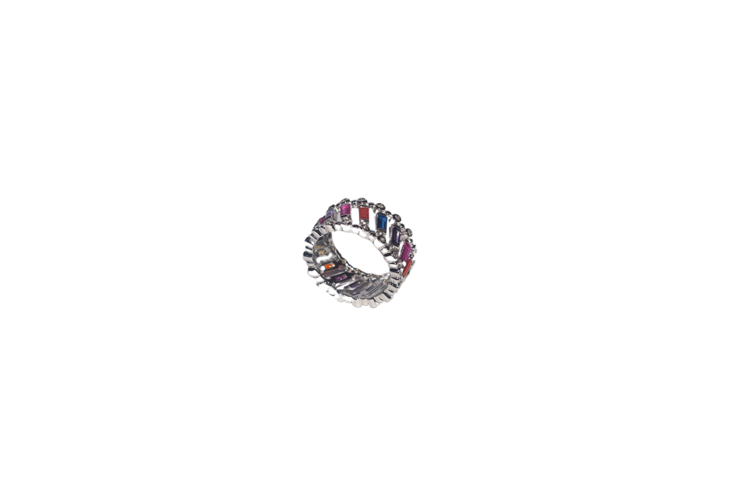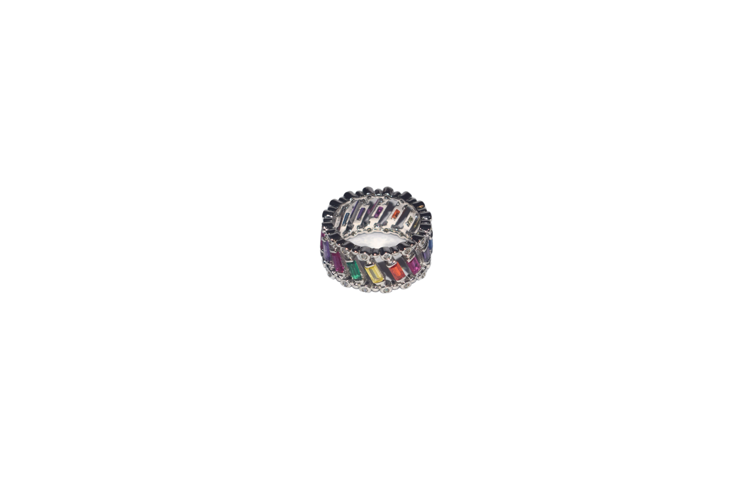Add a burst of color to your style with this sterling silver Women’s ring, designed with a bold eternity band. The ring features a stunning lineup of multi-color baguette-cut stones in rich red, green, yellow, purple, blue, and pink tones, set against polished silver. Vibrant yet elegant, this ring is perfect for those who love jewelry that makes a statement while staying versatile for everyday wear.