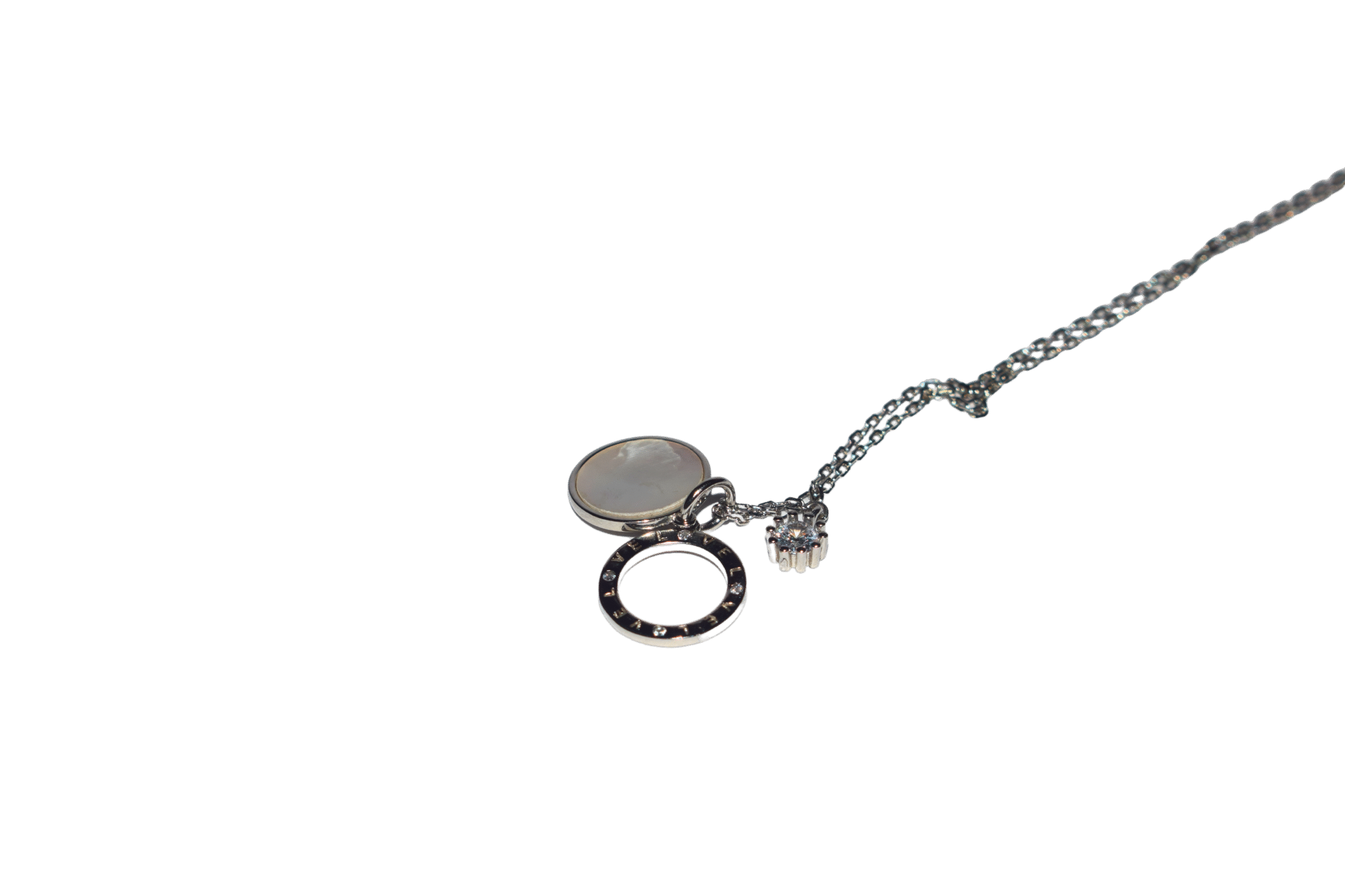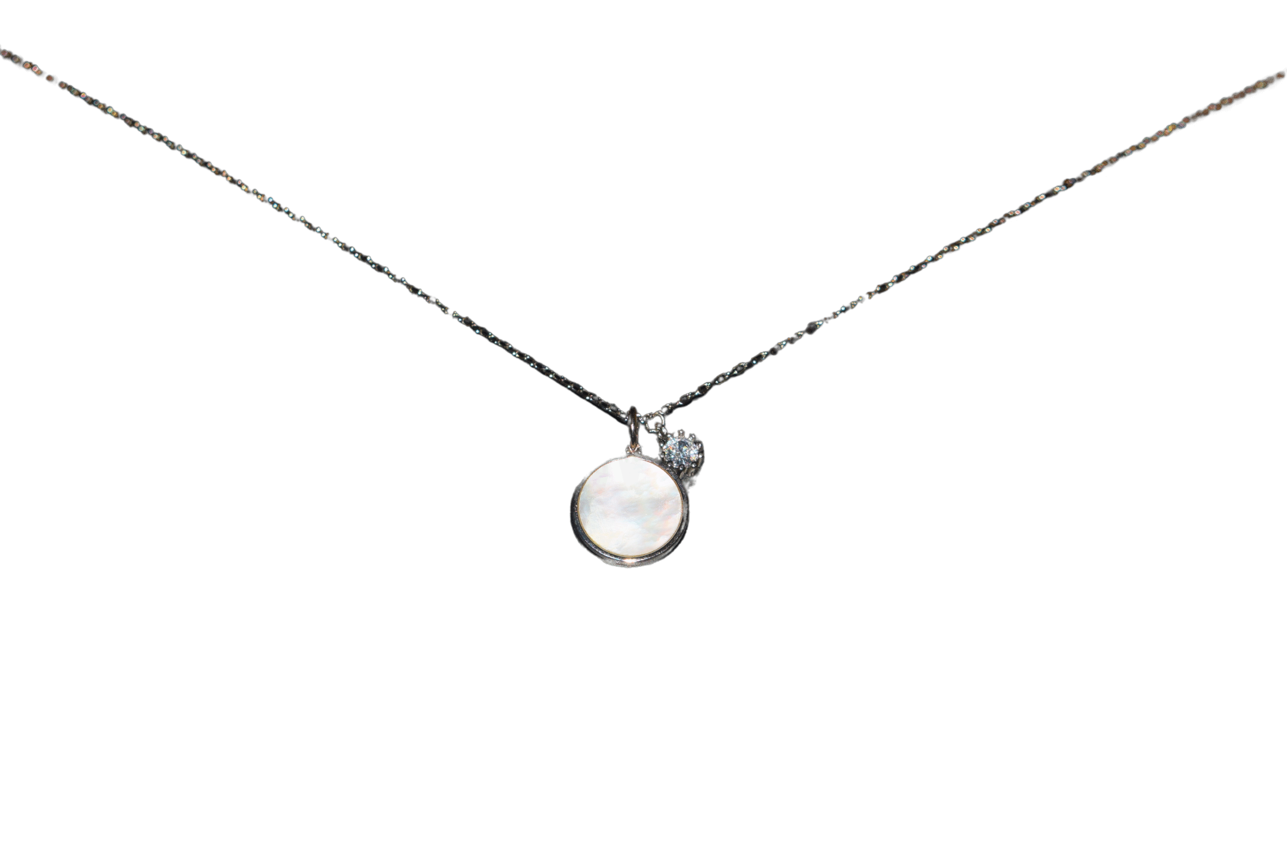 Grace meets minimalism in this elegant silver necklace, featuring a luminous mother-of-pearl pendant paired with a sparkling crystal charm. The delicate chain adds a touch of sophistication, making it perfect for both everyday wear and special occasions.