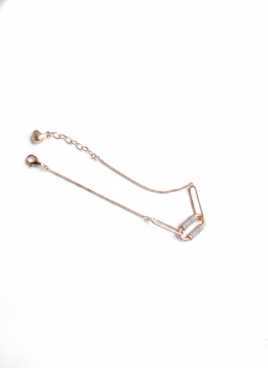 The Solenne Spark bracelet is crafted in authentic 925 sterling silver with a warm rose gold finish, designed for effortless sophistication. Featuring sleek elongated paperclip-style links accented by twin pavé-studded bars, this piece blends modern minimalism with delicate sparkle.