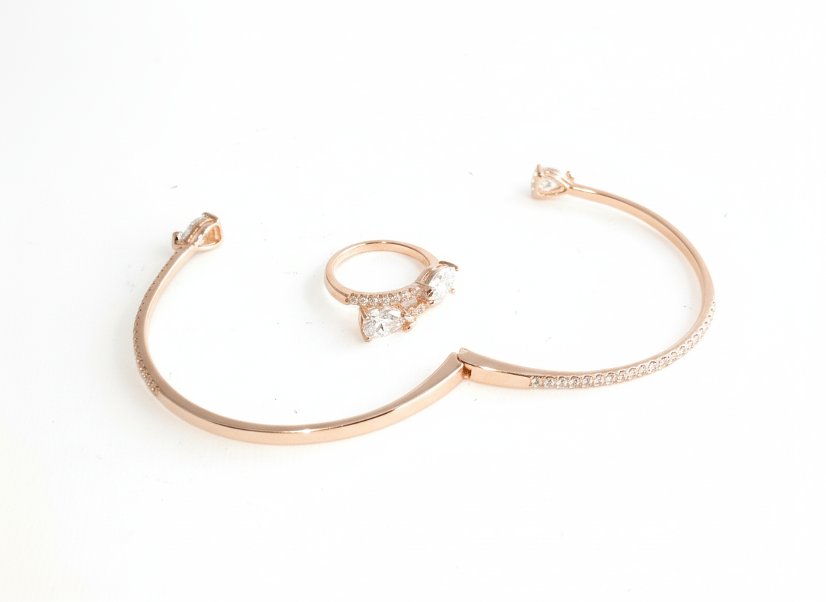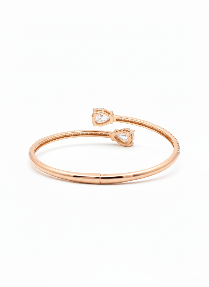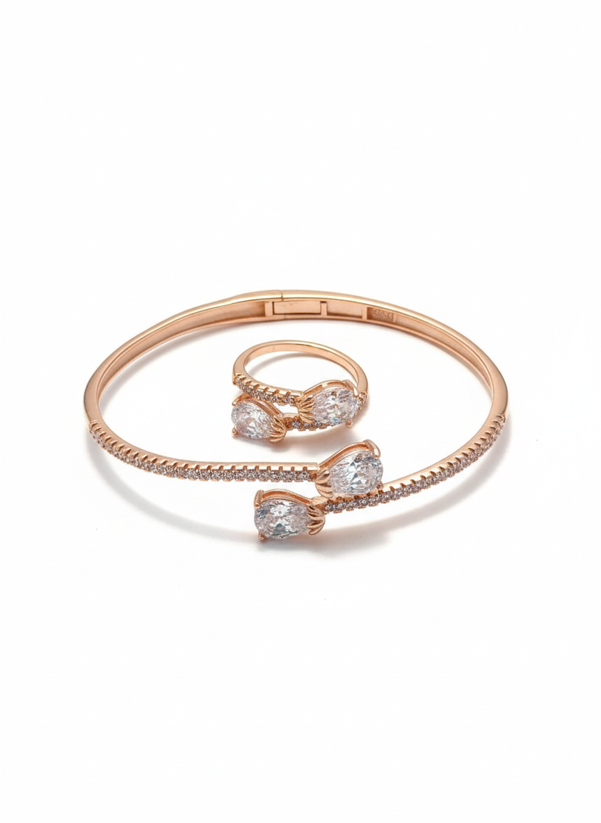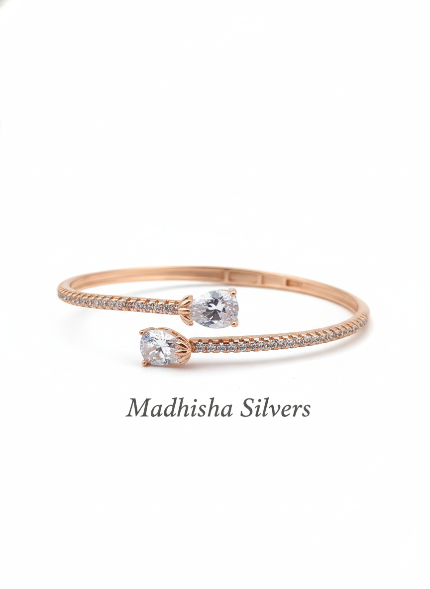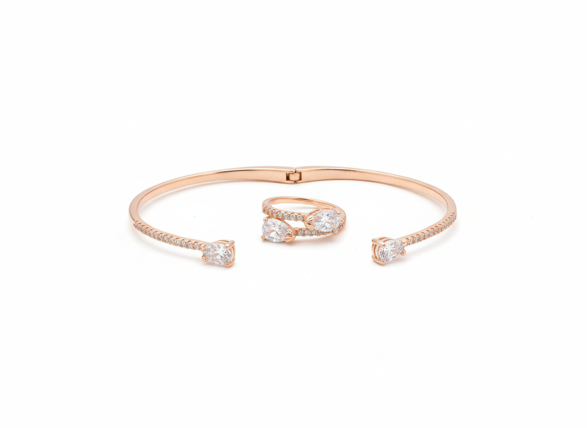 This glamorous two-piece set features a matching Kada (Cuff Bangle) and a coordinating Ring, designed to be worn together for maximum impact. Each piece is crafted from premium, certified 925 Sterling Silver and finished with luxurious Rose Gold Plating, giving the jewelry a warm, romantic blush hue.